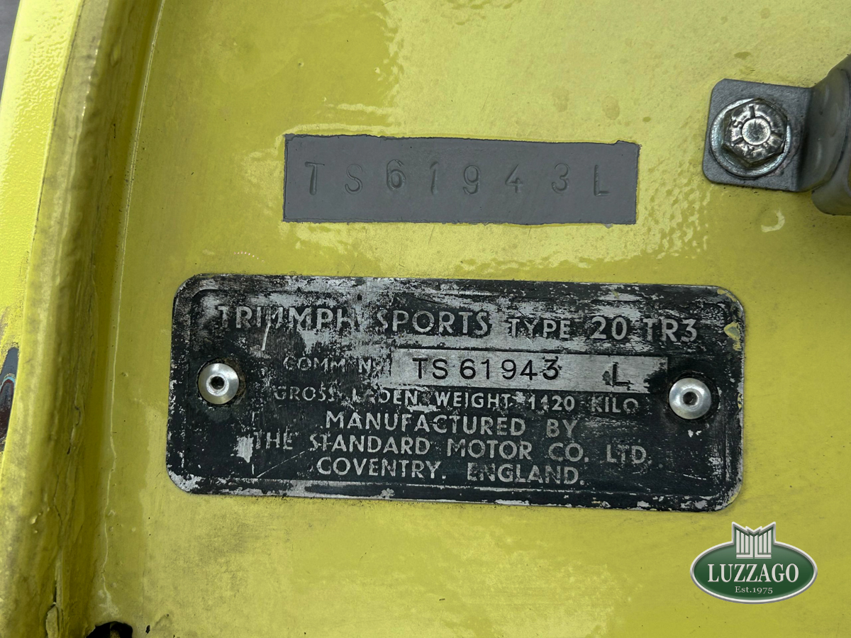 Triumph TR3 A, Baujahr November 1959, Auslieferung in Nordamerika. Nummerngleich und farbgleich, 2019 komplett restauriert (Rahmenrestaurierung). Fotos der durchgeführten Arbeiten sind vorhanden. Besitzt ein britisches Heritage-Zertifikat sowie eine ASI-Goldplakette. Zugelassen in Italien bis Januar 2025.